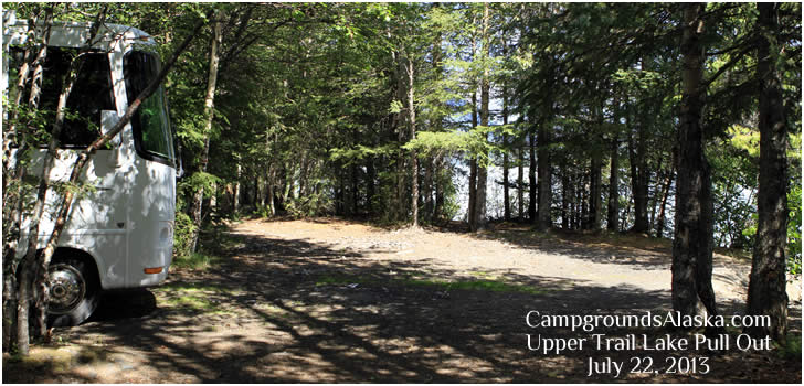 - Directions - Located at mile 31.5 along the Seward Highway between the fish hatchery and the town of Moose Pass is a large gravel peninsula protruding out into Upper Trail Lake. The turnoff is easy to miss as it's located in the sharp corner on the highway. There is a turn lane going both directions to aid in traffic.